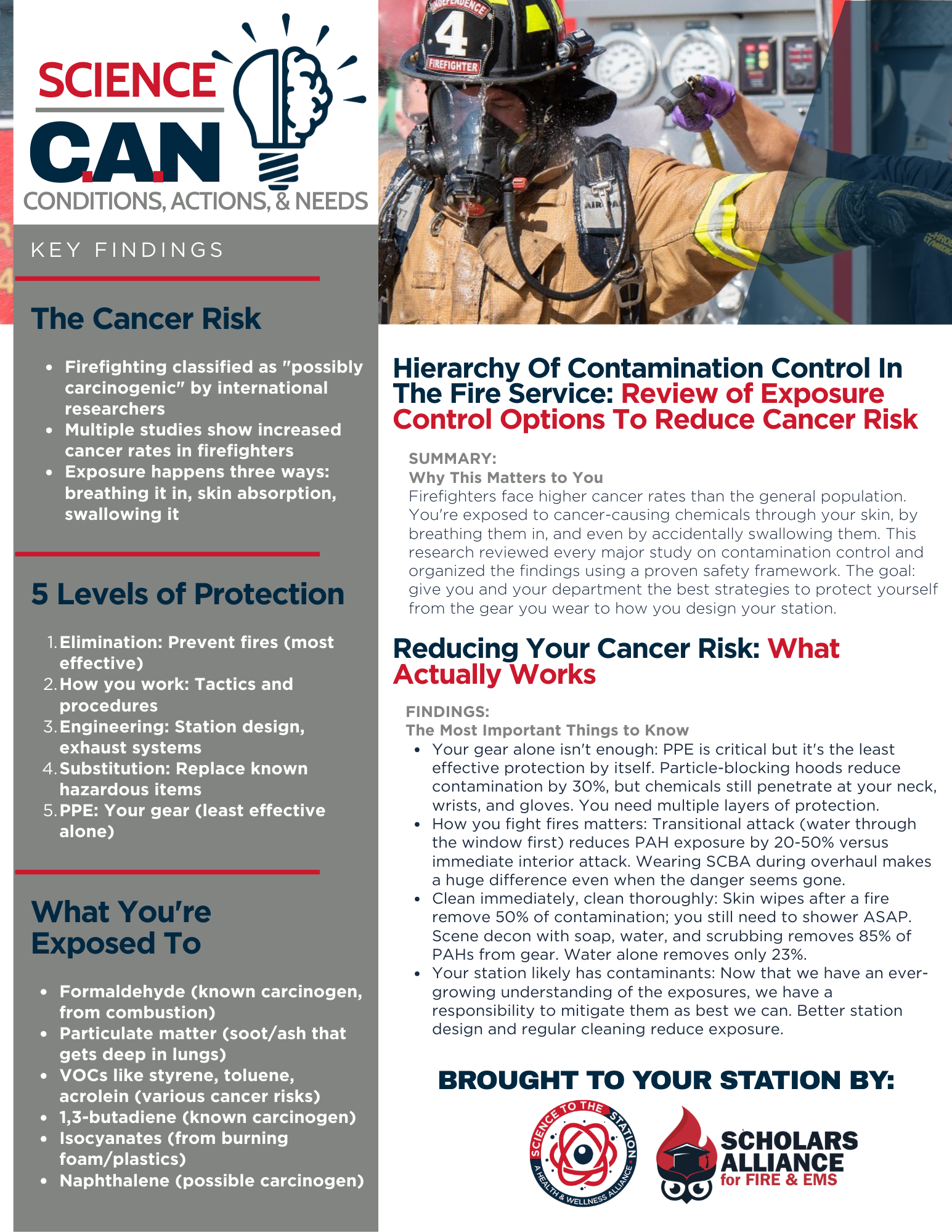 Firefighters face higher cancer rates than the general population. You're exposed to cancer-causing chemicals through your skin, by breathing them in, and even by accidentally swallowing them. This research reviewed every major study on contamination control and organized the findings using a proven safety framework. The goal: give you and your department the best strategies to protect yourself from the gear you wear to how you design your station.