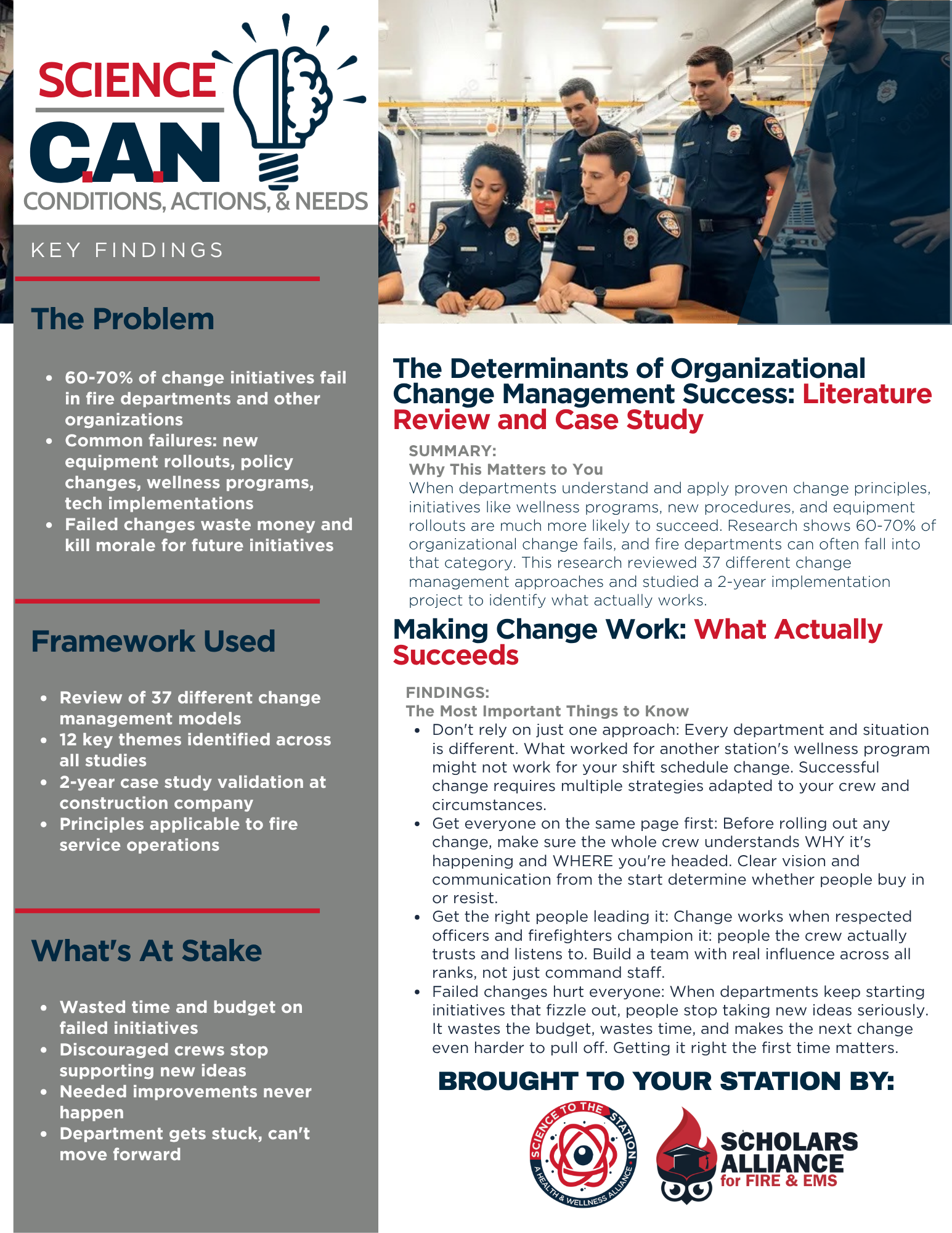 When departments understand and apply proven change principles, initiatives like wellness programs, new procedures, and equipment rollouts are much more likely to succeed. Research shows 60-70% of organizational change fails, and fire departments can often fall into that category. This research reviewed 37 different change management approaches and studied a 2-year implementation project to identify what actually works.